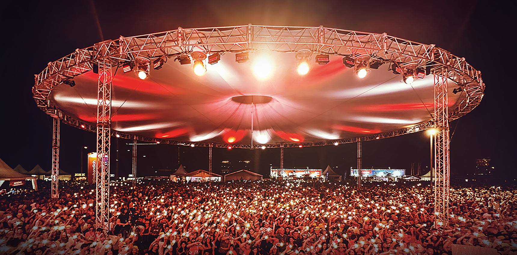 Durch die variablen Bauhöhen (Traufhöhen von bis zu 10 Metern) entsteht ein beeindruckendes Raumgefühl. Dadurch eignet sich der skyliner auch hervorragend als Bühnenüberdachung.